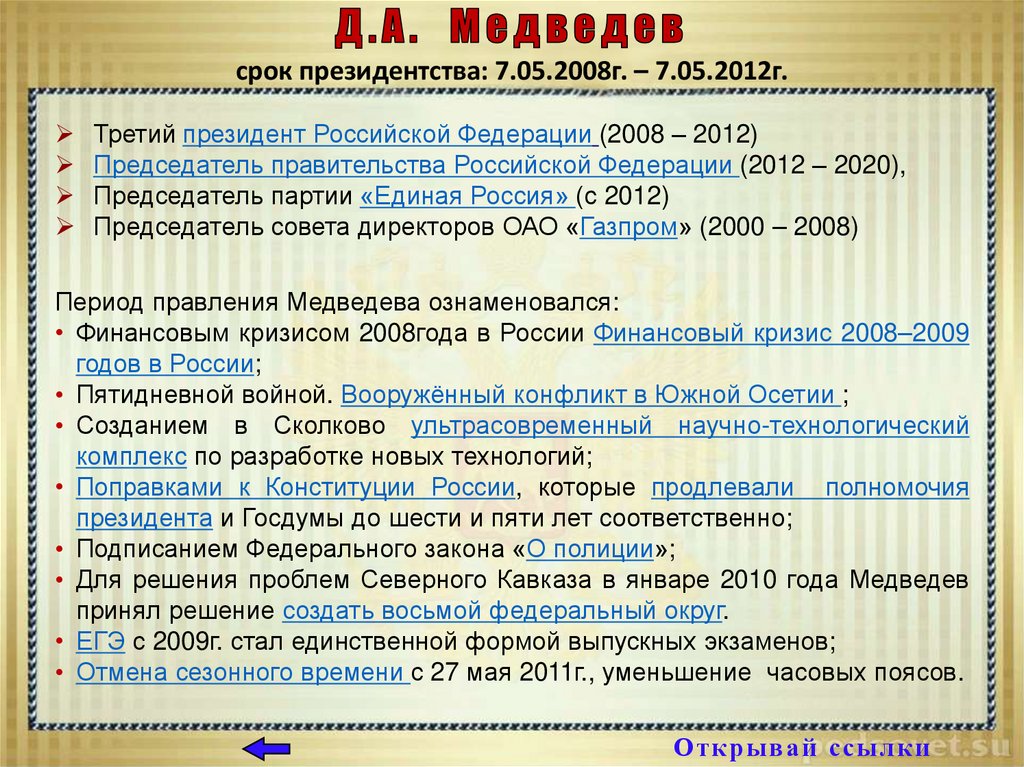 срок президентства: 7.05.2008г. – 7.05.2012г.Третий президент Российской Федерации (2008 – 2012)