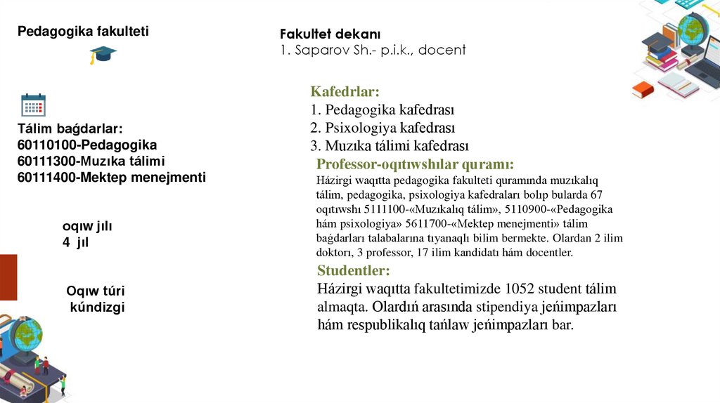 Pedagogika fakultetiTálim baǵdarlar: