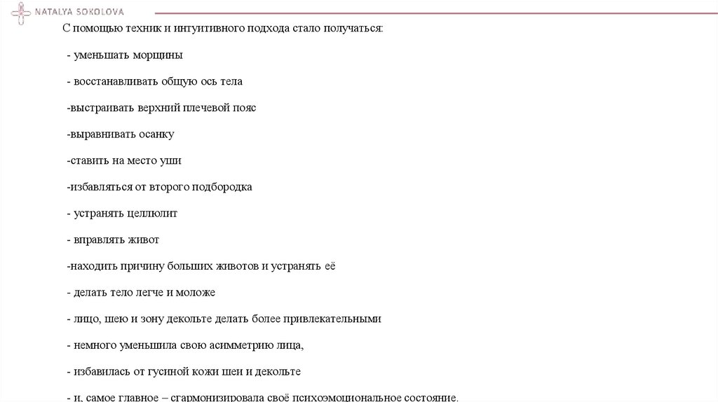 С помощью техник и интуитивного подхода стало получаться:- уменьшать морщины
