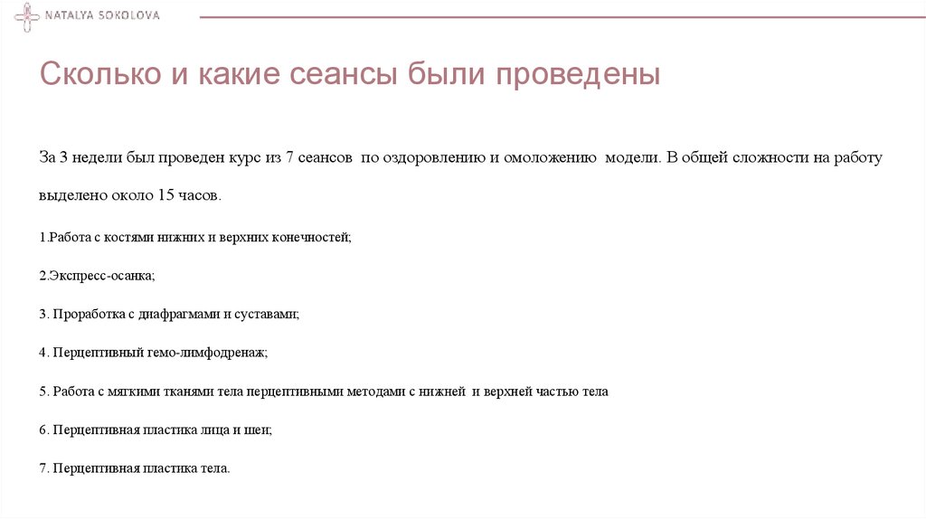 Сколько и какие сеансы были проведеныЗа 3 недели был проведен курс из 7 сеансов по оздоровлению и омоложению модели. В общей сложности на работу