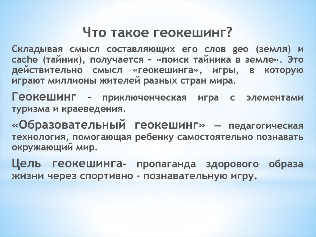 Что такое геокешинг?Складывая смысл составляющих его слов geo (земля) и