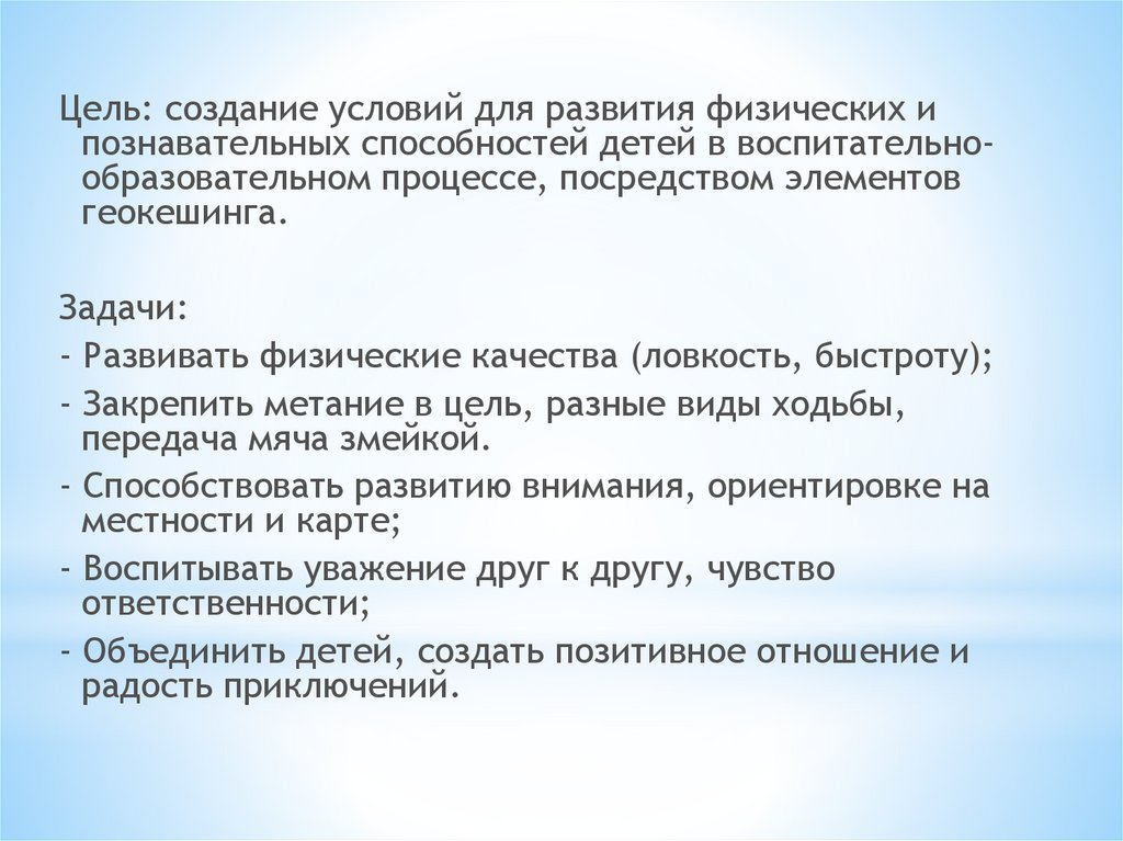 Цель: создание условий для развития физических ипознавательных способностей детей в воспитательнообразовательном процессе, посредством элементов