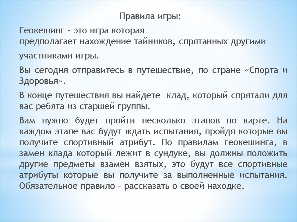 Правила игры:Геокешинг – это игра которая