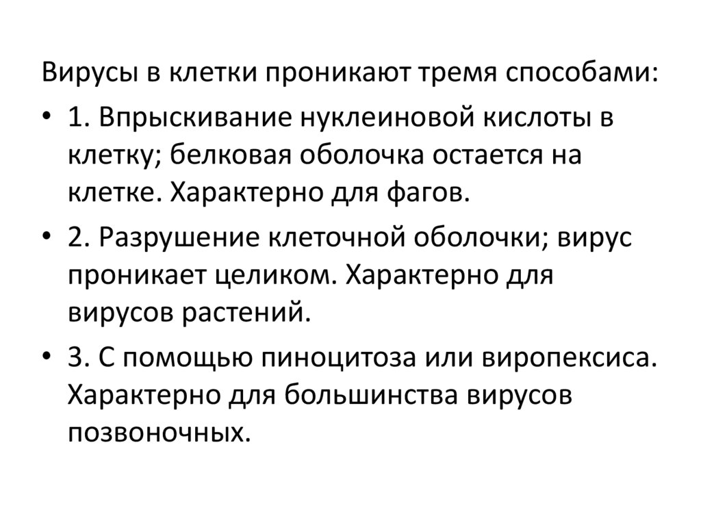 Вирусы в клетки проникают тремя способами:• 1. Впрыскивание нуклеиновой кислоты в
