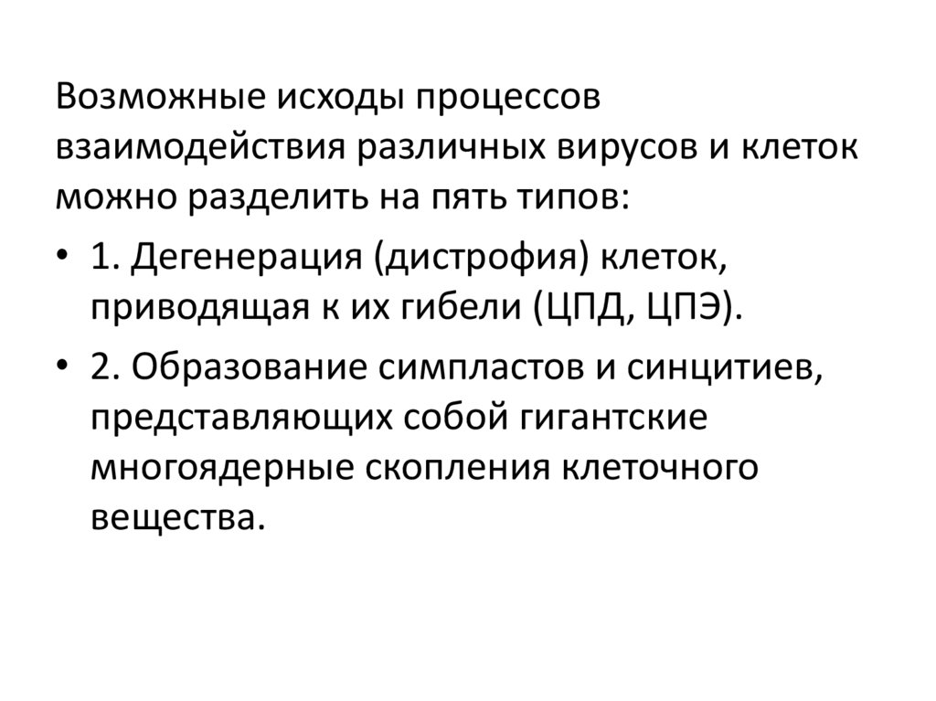 Возможные исходы процессоввзаимодействия различных вирусов и клеток