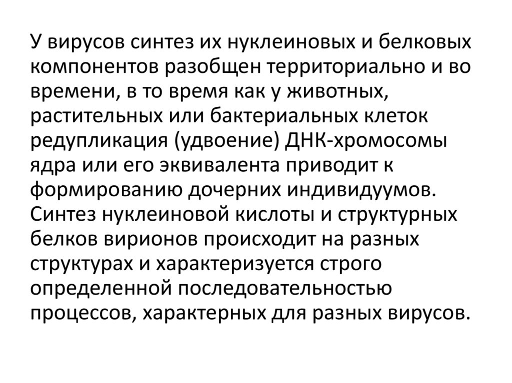 У вирусов синтез их нуклеиновых и белковыхкомпонентов разобщен территориально и во