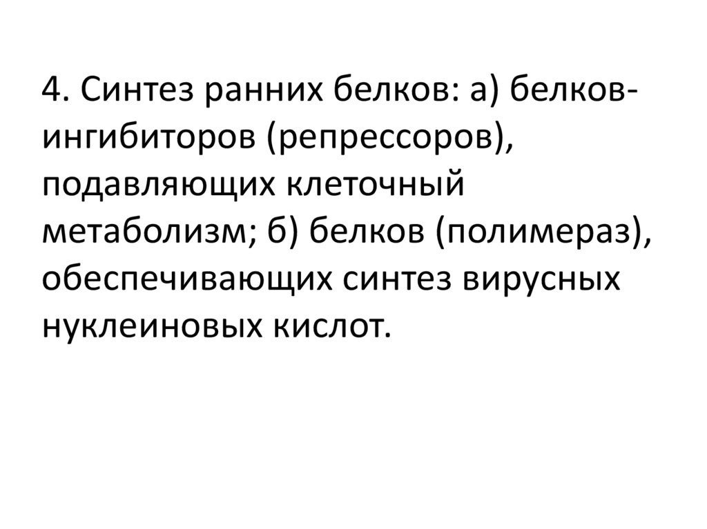 4. Синтез ранних белков: а) белковингибиторов (репрессоров),подавляющих клеточный