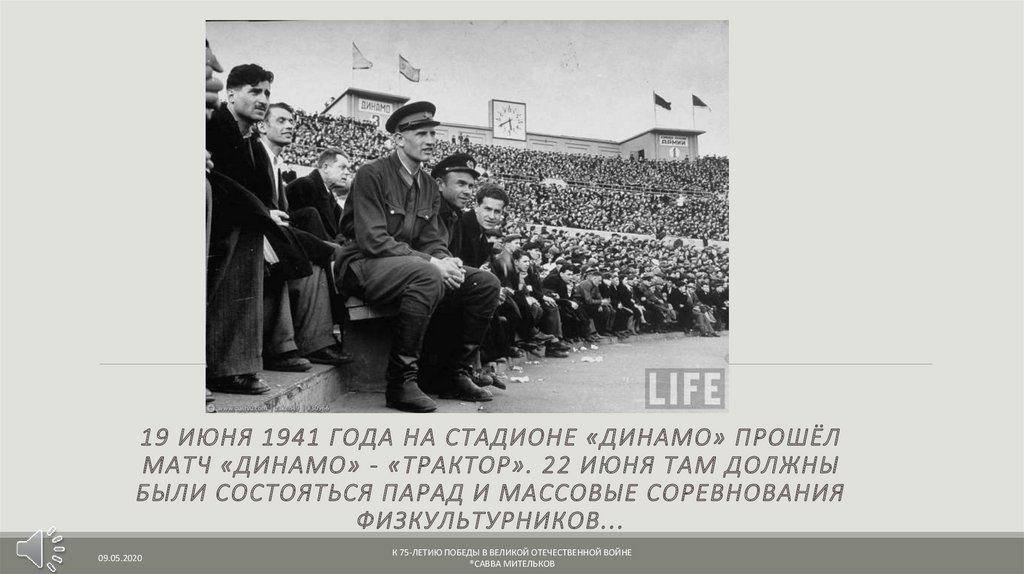 19 ИЮНЯ 1941 ГОДА НА СТАДИОНЕ «ДИНАМО» ПРОШЁЛМАТЧ «ДИНАМО» - «ТРАКТОР». 22 ИЮНЯ ТАМ ДОЛЖНЫ