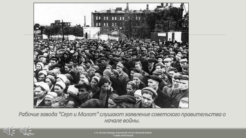 Рабочие завода "Серп и Молот" слушают заявление советского правительства оначале войны.