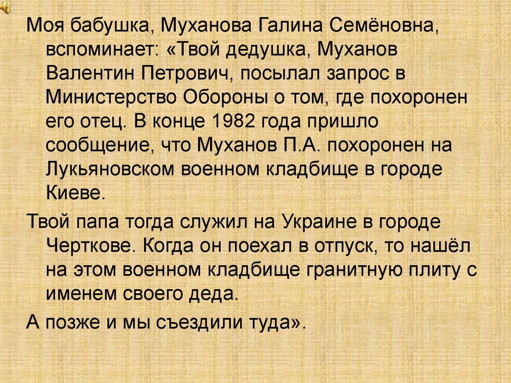 Моя бабушка, Муханова Галина Семёновна,вспоминает: «Твой дедушка, Муханов
