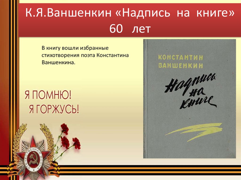 К.Я.Ваншенкин «Надпись на книге»60 лет