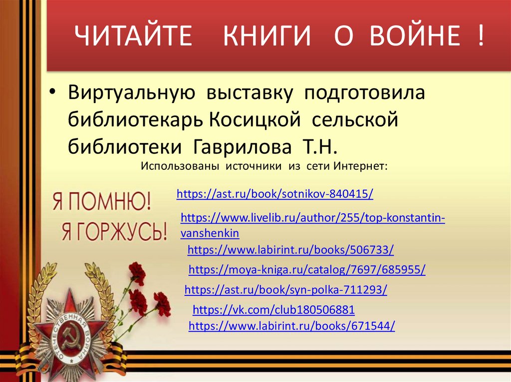 ЧИТАЙТЕ КНИГИ О ВОЙНЕ !• Виртуальную выставку подготовила