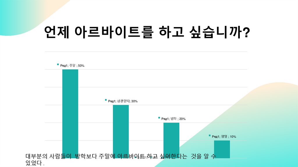 언제 아르바이트를 하고 싶습니까?Ряд1; 주말 ; 50%