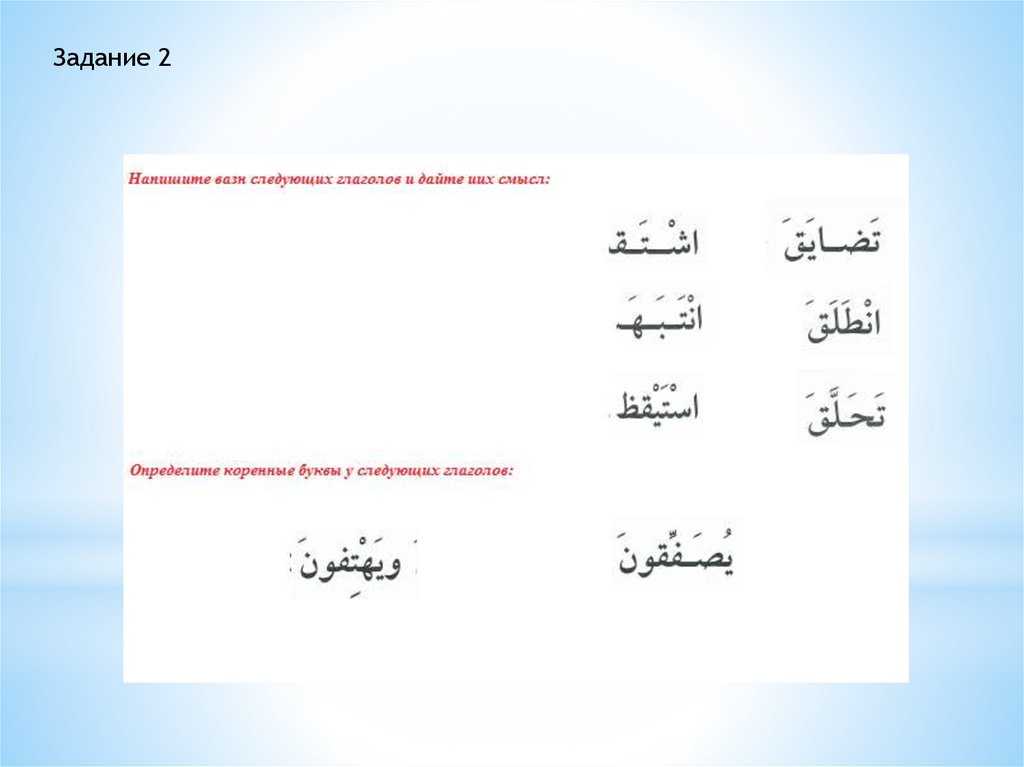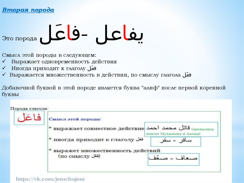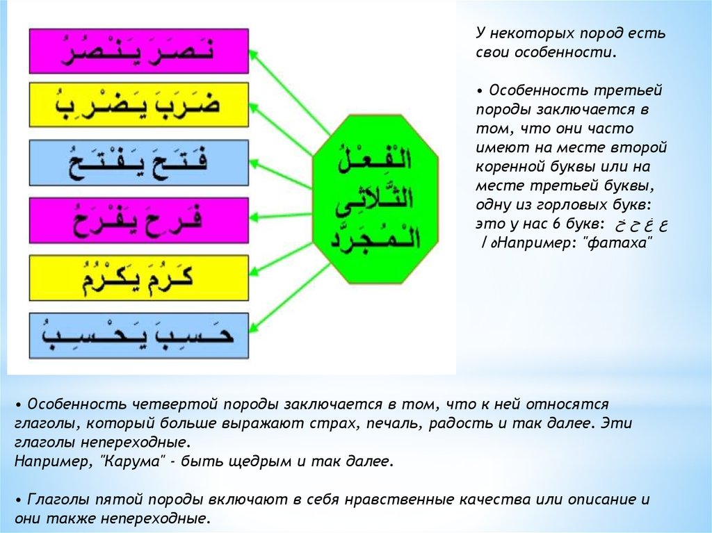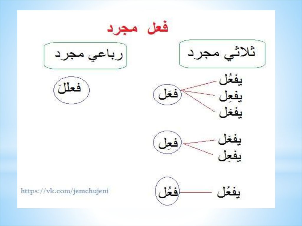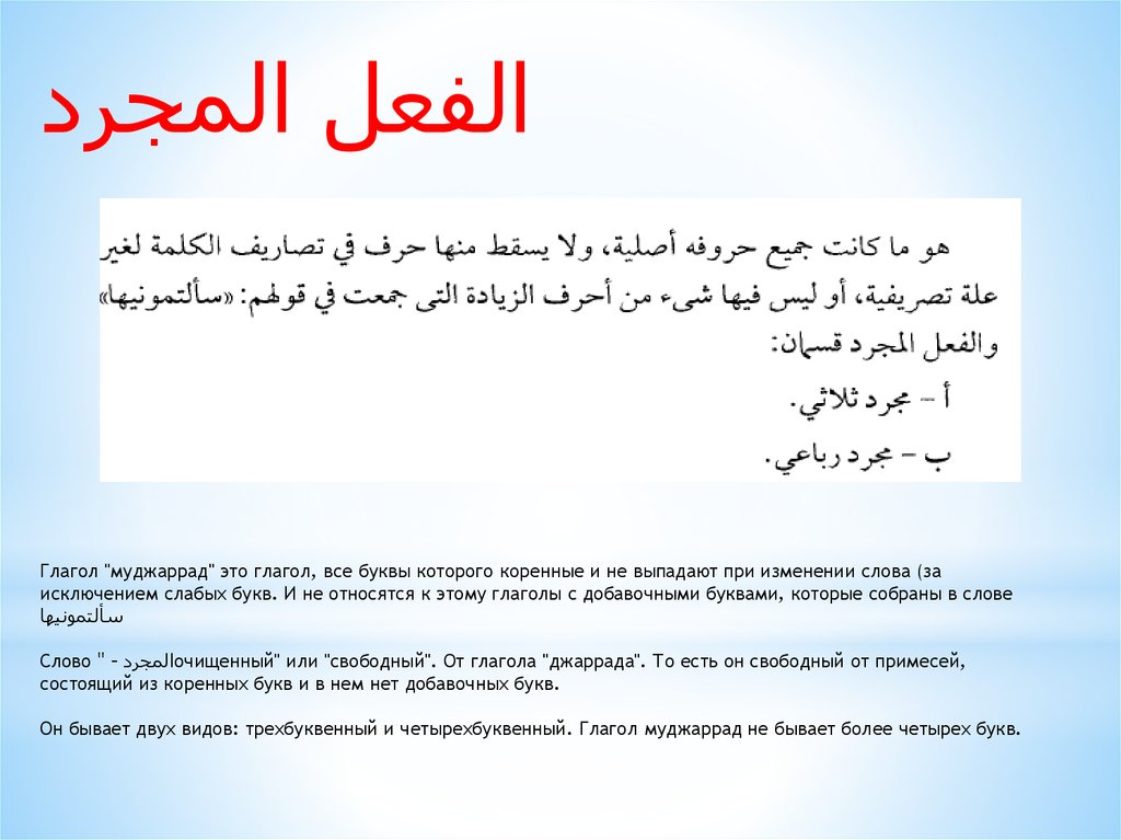 الفعل المجردГлагол "муджаррад" это глагол, все буквы которого коренные и не выпадают при изменении слова (за