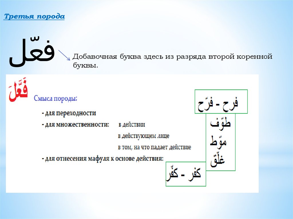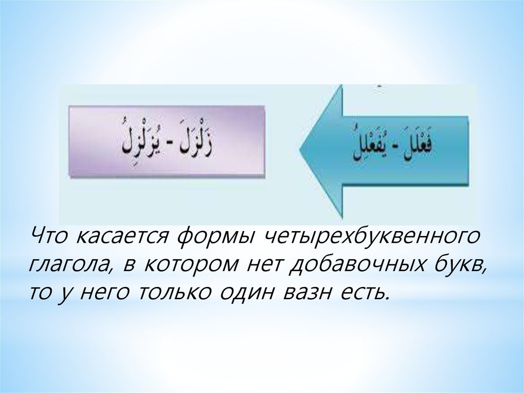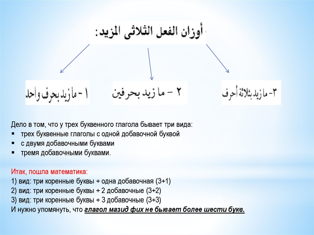 Он бывает двух видов: трехбуквенный и четырехбуквенный. Глагол муджаррад не бывает более четырех букв.