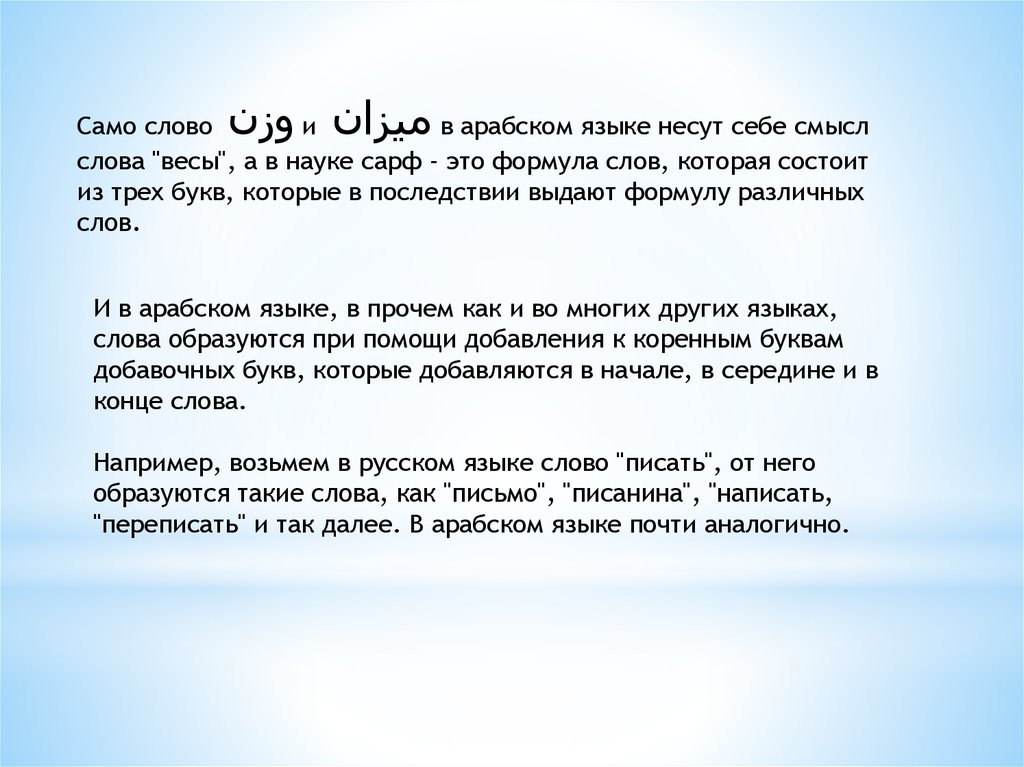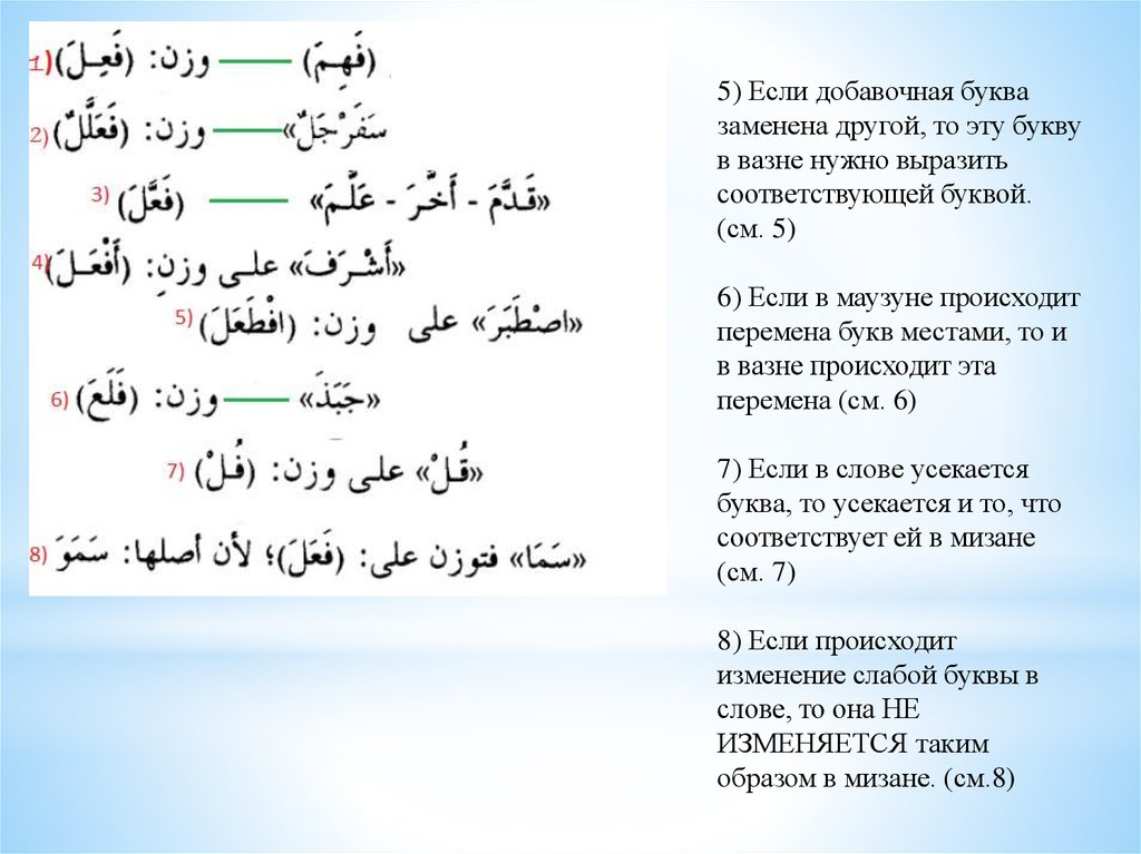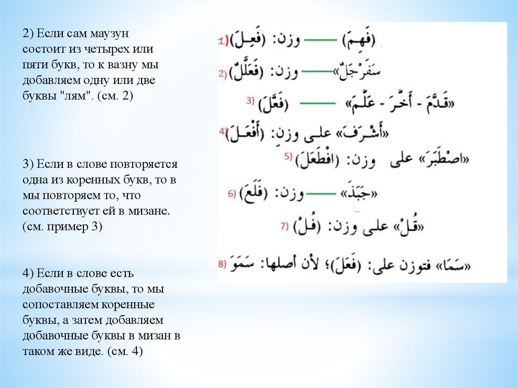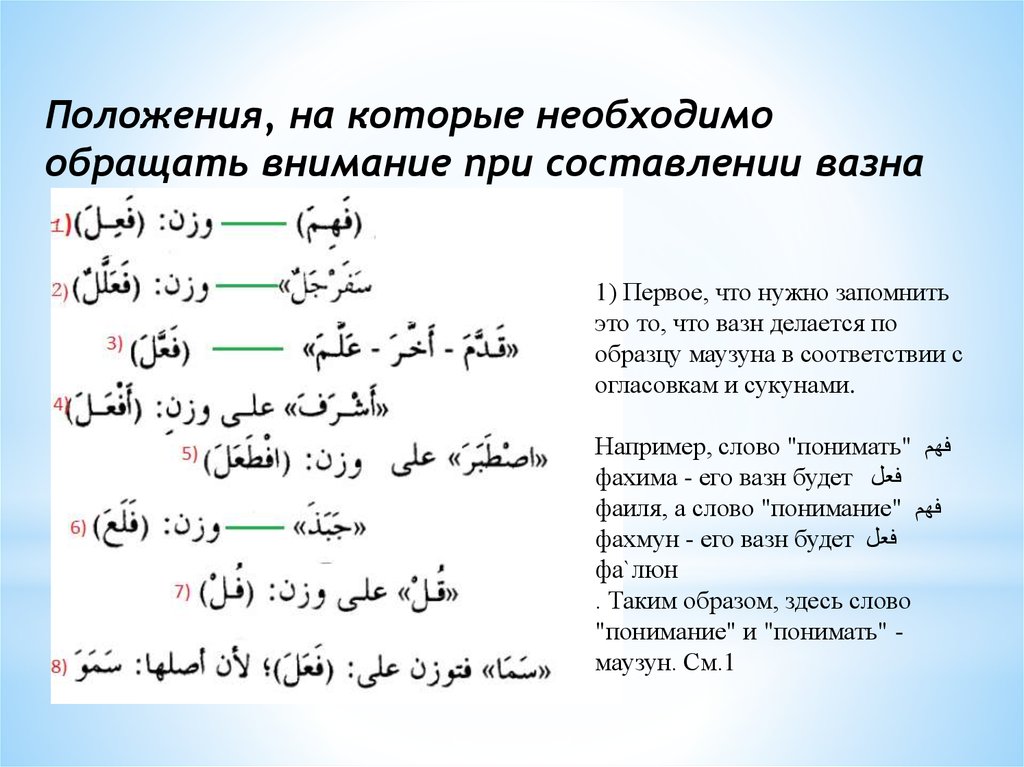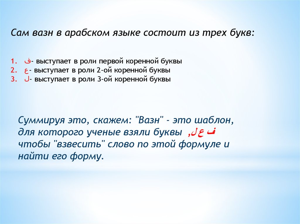Сам вазн в арабском языке состоит из трех букв:1. ف- выступает в роли первой коренной буквы