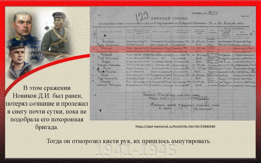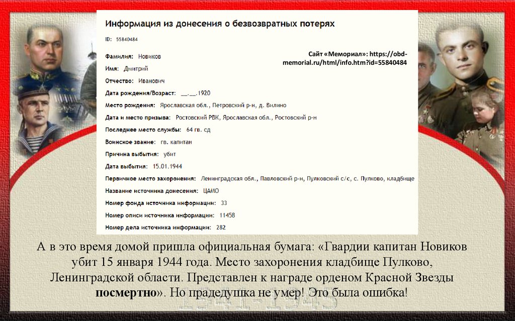 Сайт «Мемориал»: https://obdmemorial.ru/html/info.htm?id=55840484А в это время домой пришла официальная бумага: «Гвардии капитан Новиков