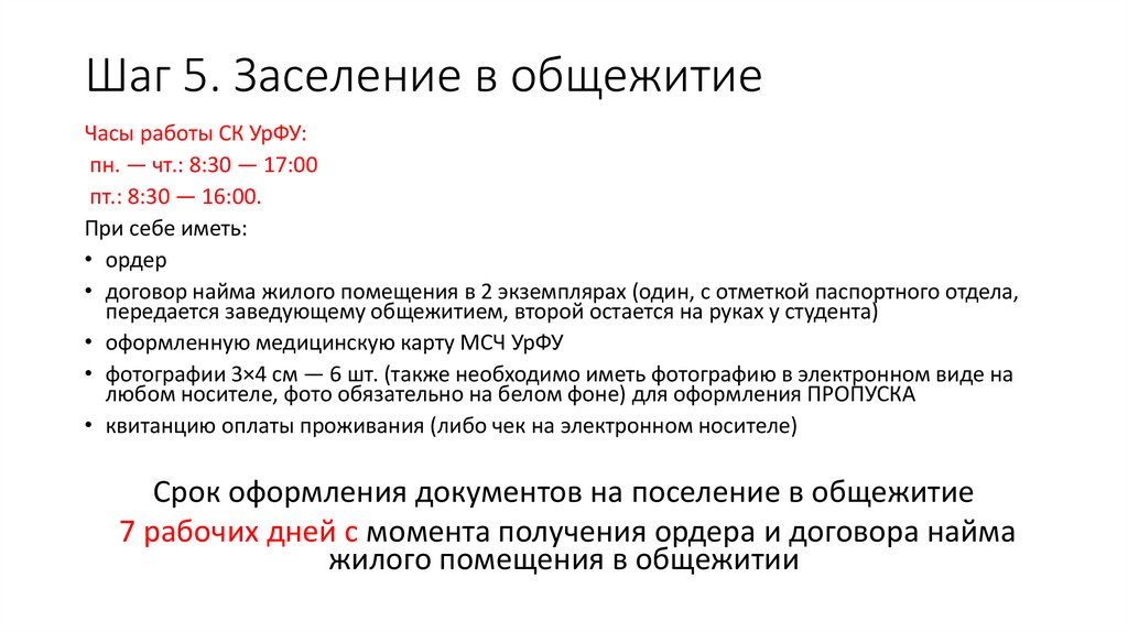 Шаг 5. Заселение в общежитиеЧасы работы СК УрФУ: