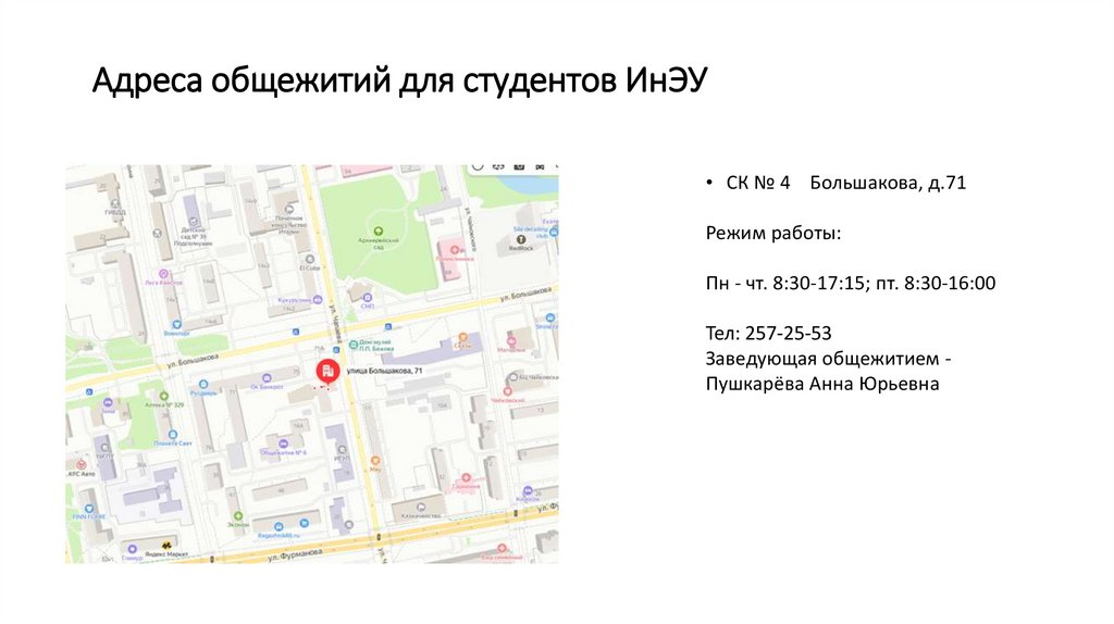 Адреса общежитий для студентов ИнЭУ• СК № 4 Большакова, д.71