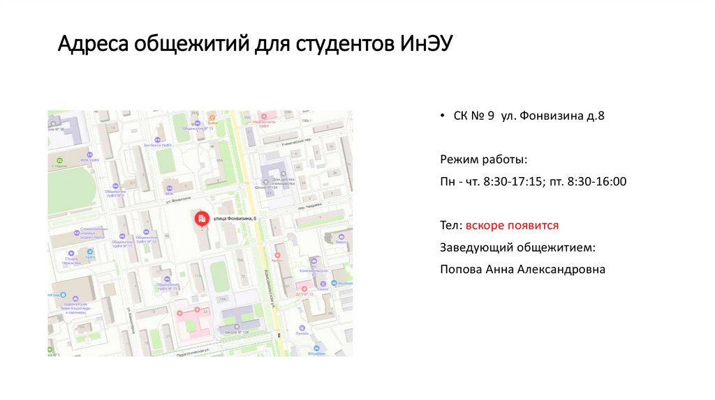 Адреса общежитий для студентов ИнЭУ• СК № 9 ул. Фонвизина д.8