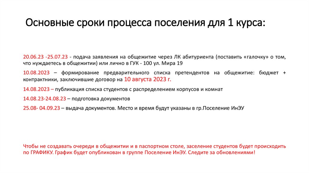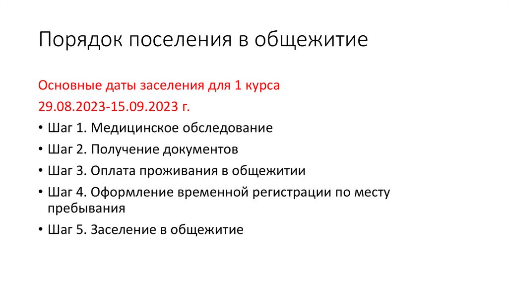 Порядок поселения в общежитиеОсновные даты заселения для 1 курса
