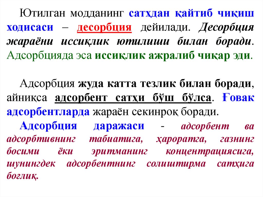 ютса – бундай жараён адсорбция дейилади.