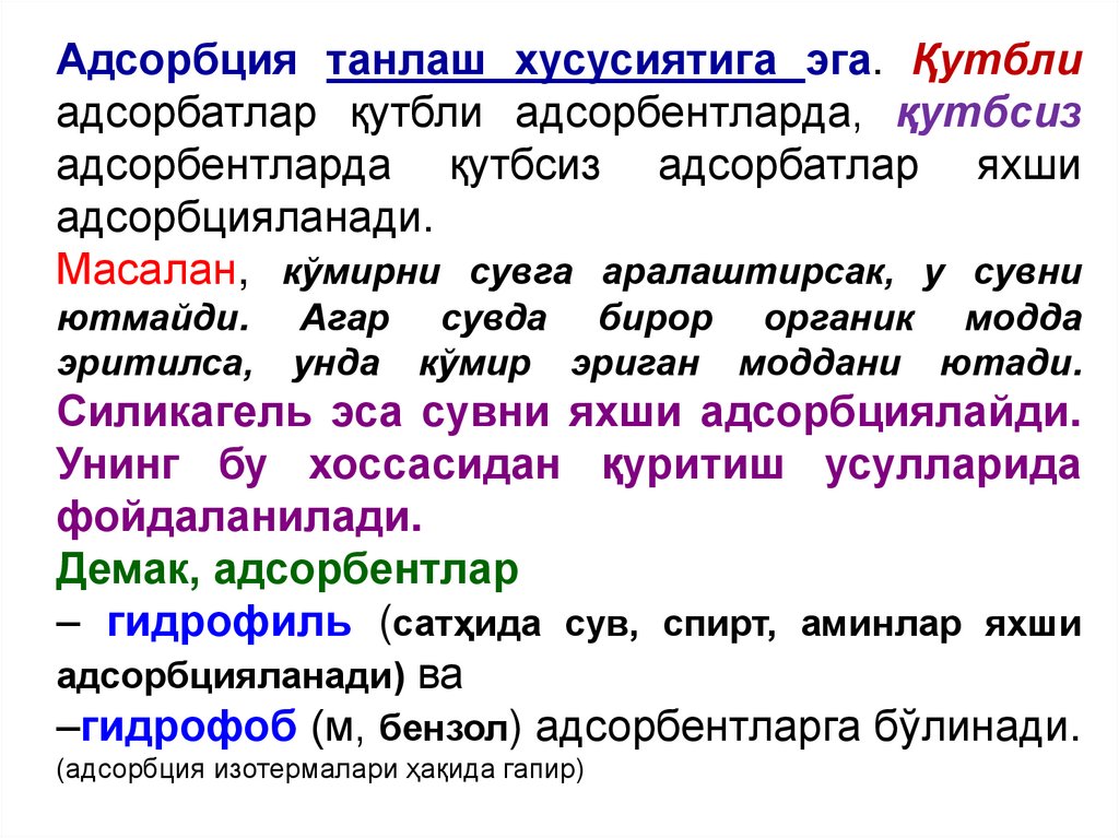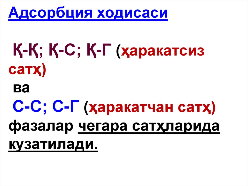 тушунтиради), адсорбцияланаётган модданинг агрегат холатини хисобга