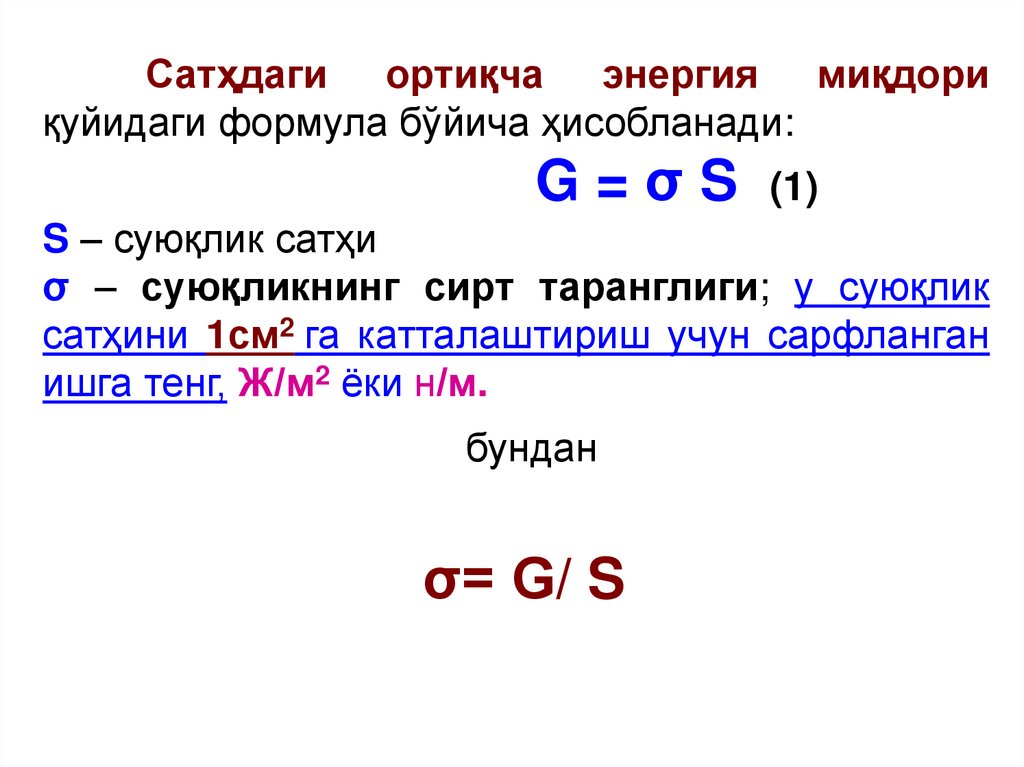 Сатҳдаги ортиқча энергия миқдориқуйидаги формула бўйича ҳисобланади:
