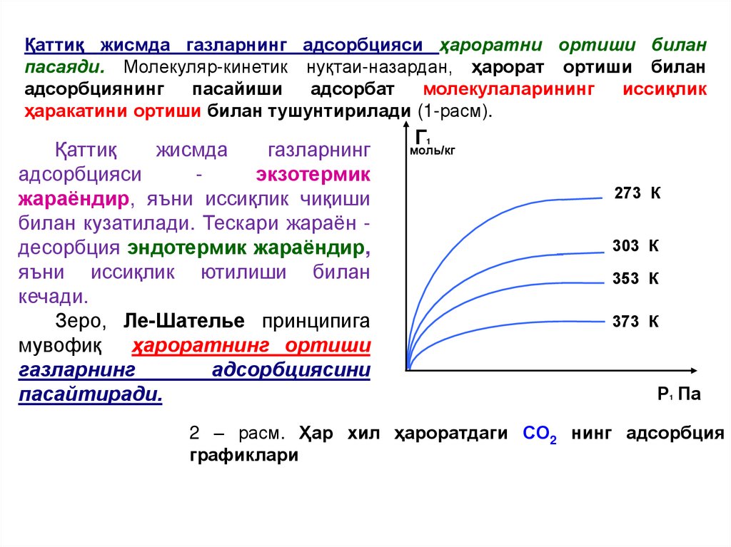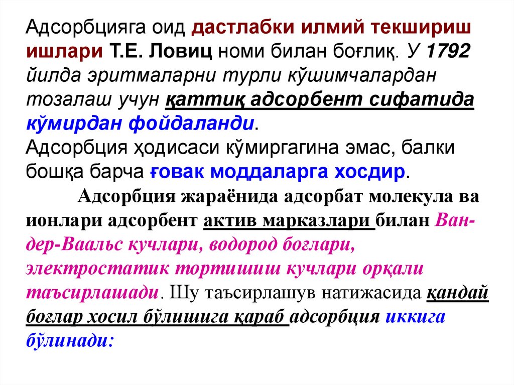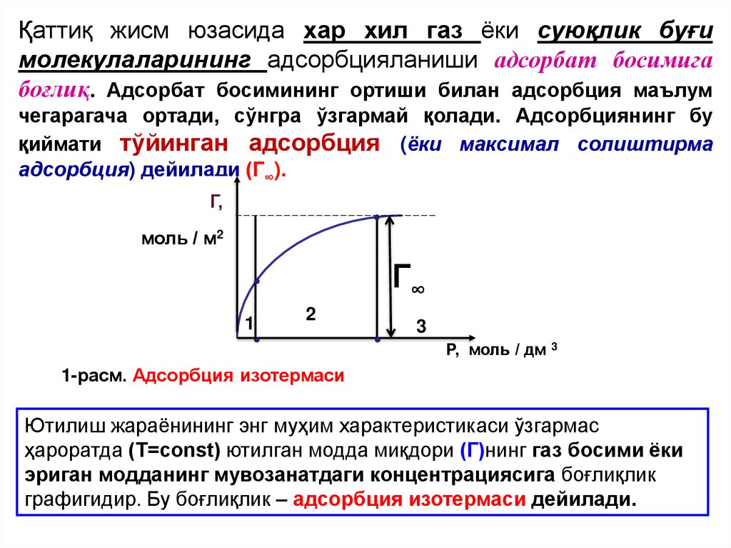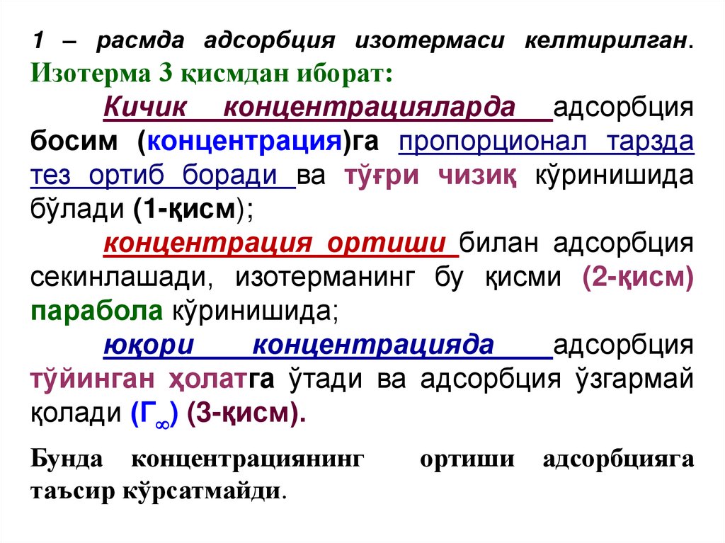 1)адсорбция соф физикавий кучлар таъсирида содир бўлади;