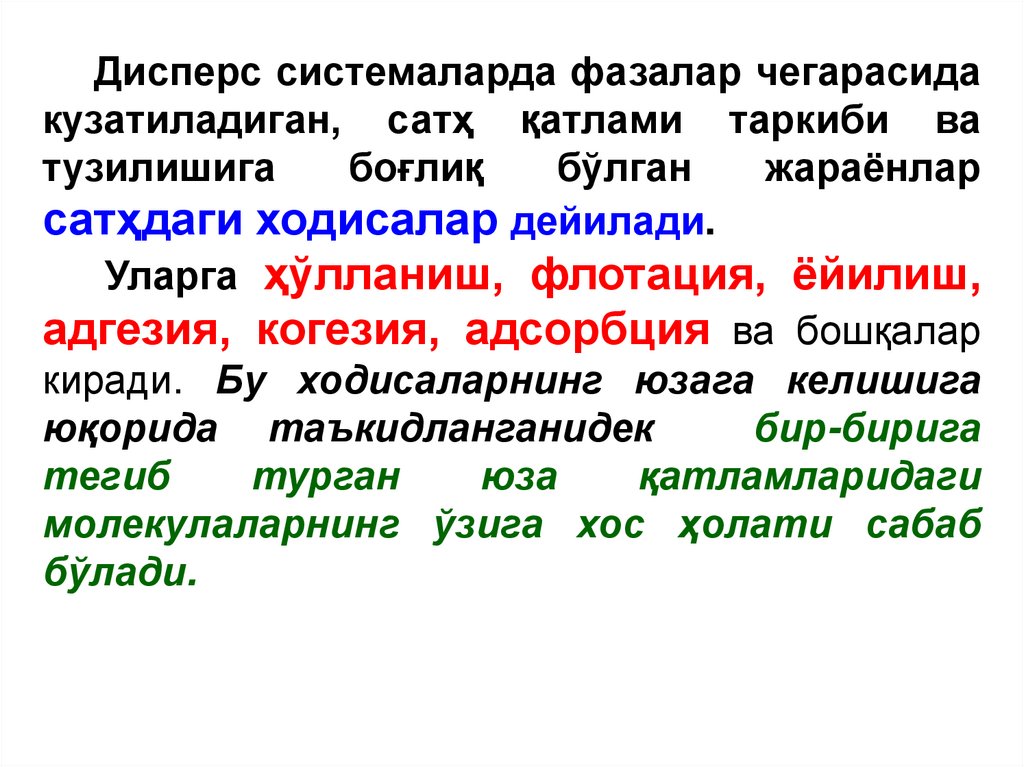 адгезия, когезия, адсорбция ва бошқалар