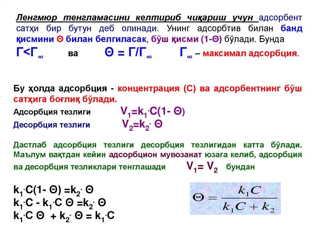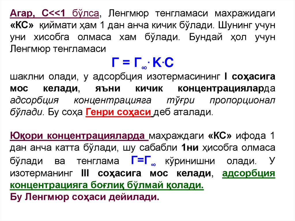 Гmax – адсорбент сиртидаги барча актив марказлар тўйинганда адсорбатнинг адсорбент
