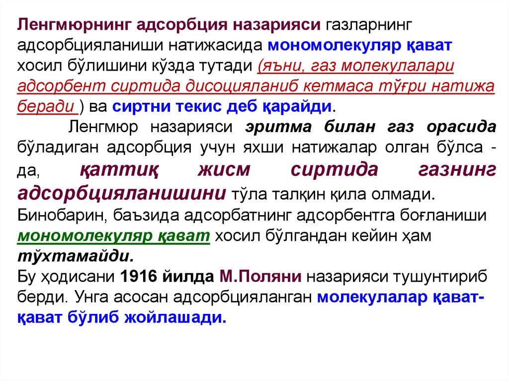 Ленгмюрнинг мономолекуляр адсорбция ва Полянининг