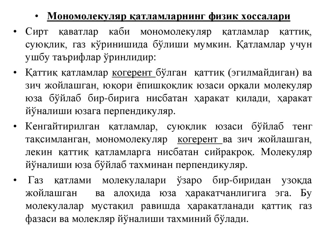 Monomolekulyar qаtlаmdаgi molekulаlаr xossаsi.Gаz xossаsi molekulаlаr о‘zаro bir-biridаn uzoq joylаshgаn