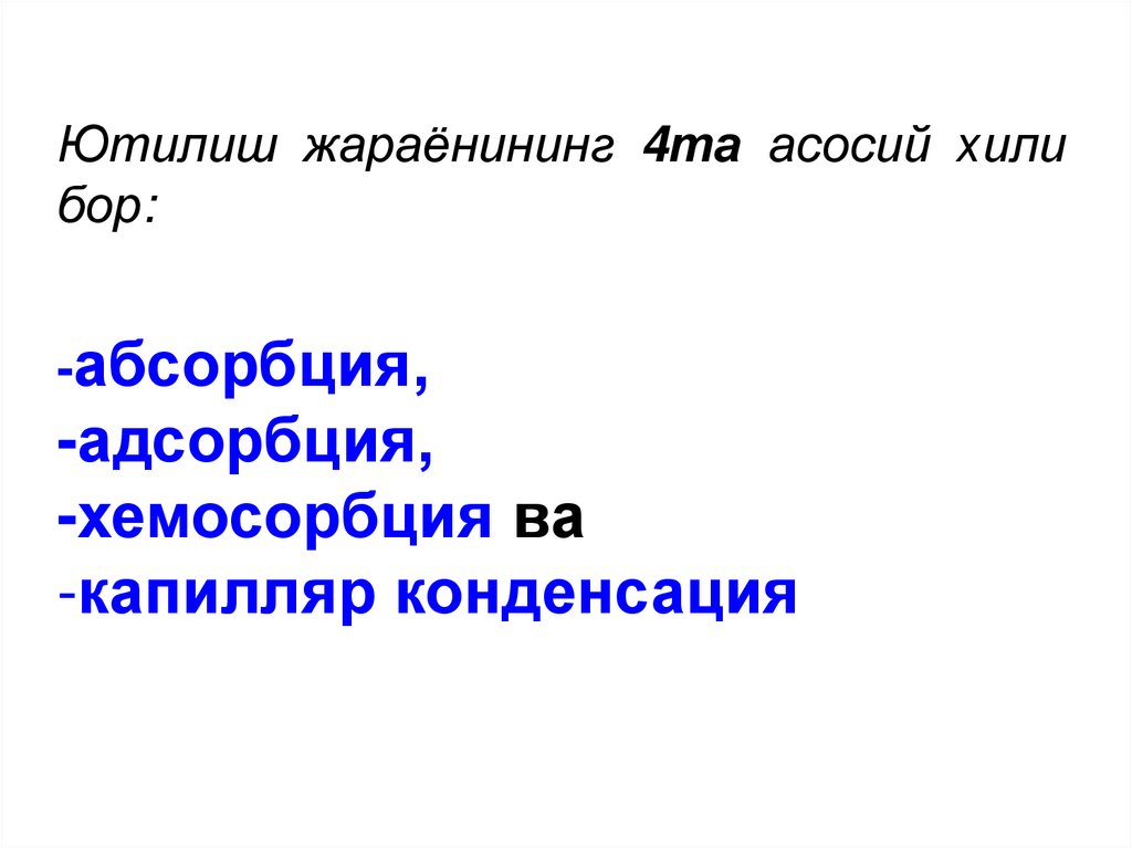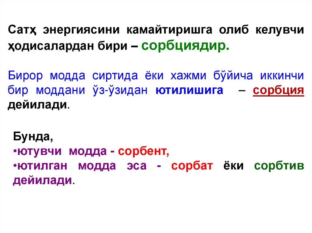 Сатҳ энергиясини камайтиришга олиб келувчиҳодисалардан бири – сорбциядир.