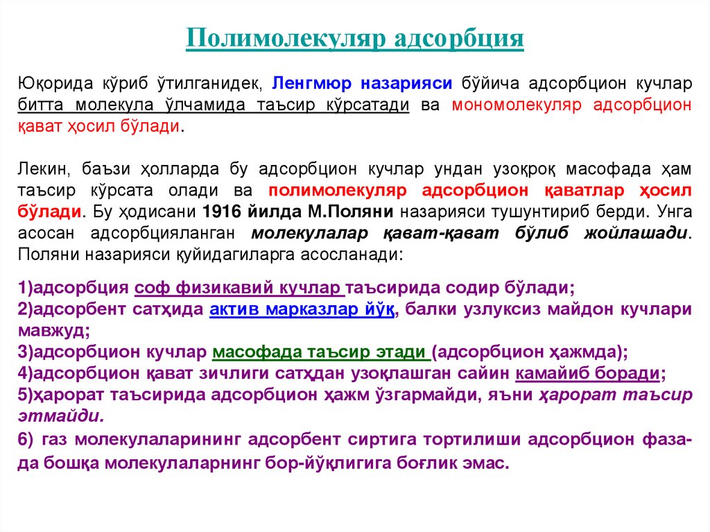 Полимолекуляр адсорбцияЮқорида кўриб ўтилганидек, Ленгмюр назарияси бўйича адсорбцион кучлар