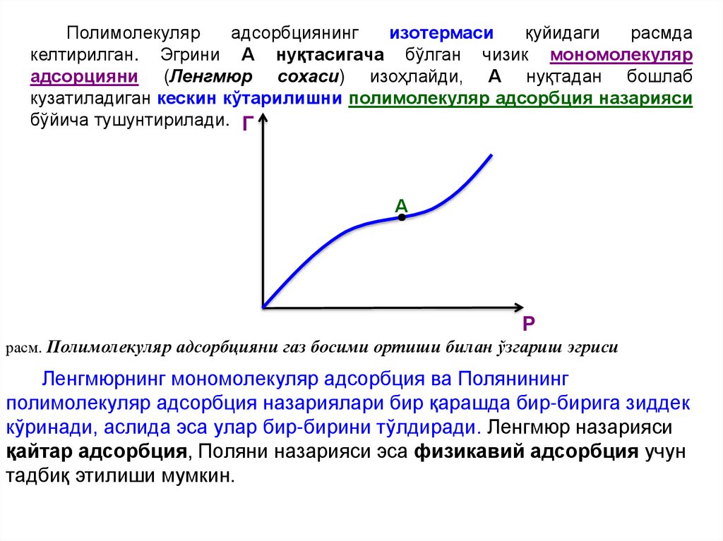 адсорцияни (Ленгмюр сохаси) изоҳлайди, А нуқтадан бошлаб