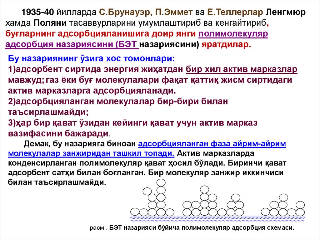 1935-40 йилларда С.Брунауэр, П.Эммет ва Е.Теллерлар Ленгмюрхамда Поляни тасаввурларини умумлаштириб ва кенгайтириб,