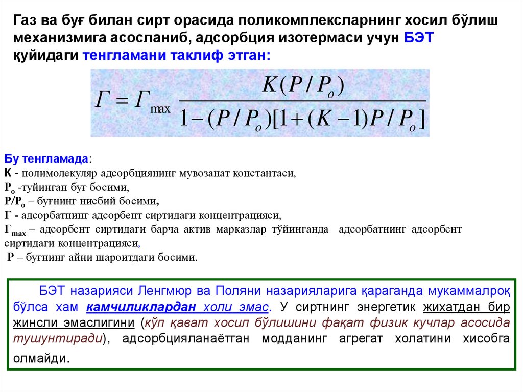 Газ ва буғ билан сирт орасида поликомплексларнинг хосил бўлишмеханизмига асосланиб, адсорбция изотермаси учун БЭТ