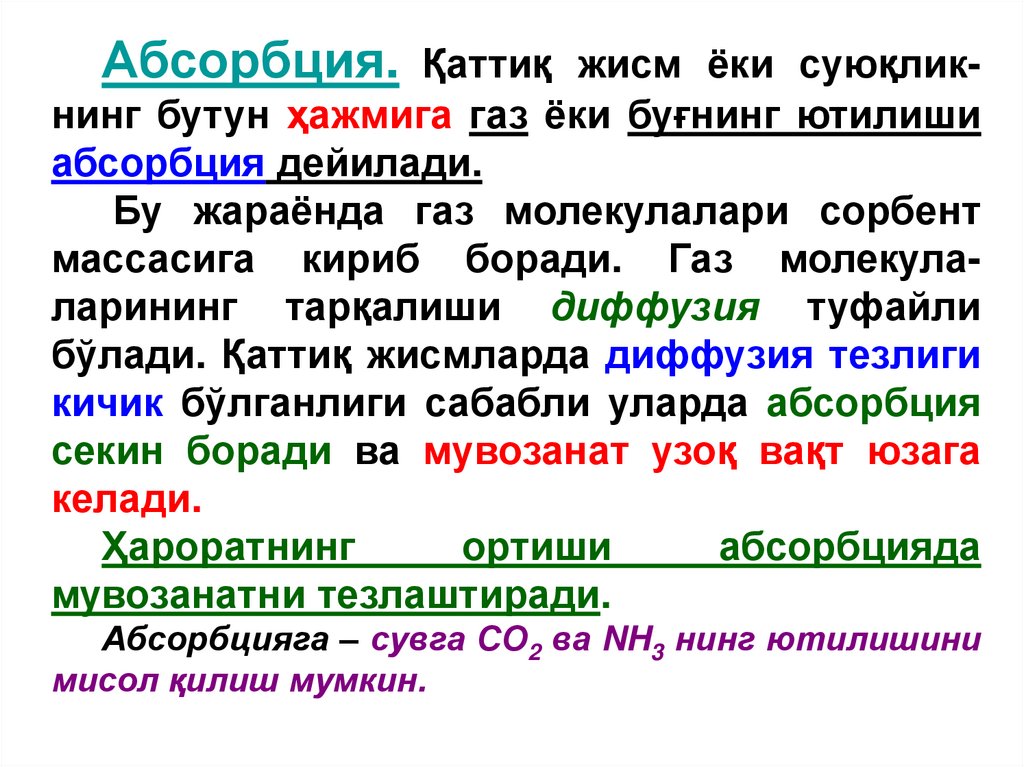 Абсорбцияга – сувга СО2 ва NH3 нинг ютилишини