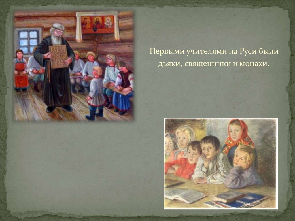 Первыми учителями на Руси былидьяки, священники и монахи.