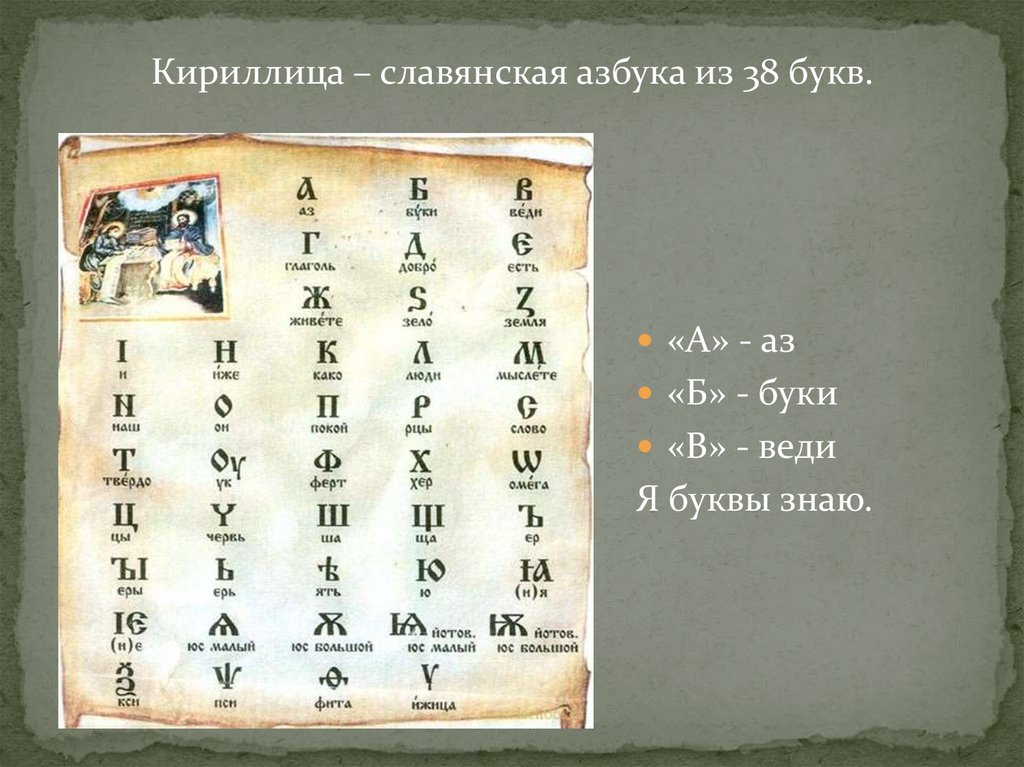 Кириллица – славянская азбука из 38 букв.«А» - аз