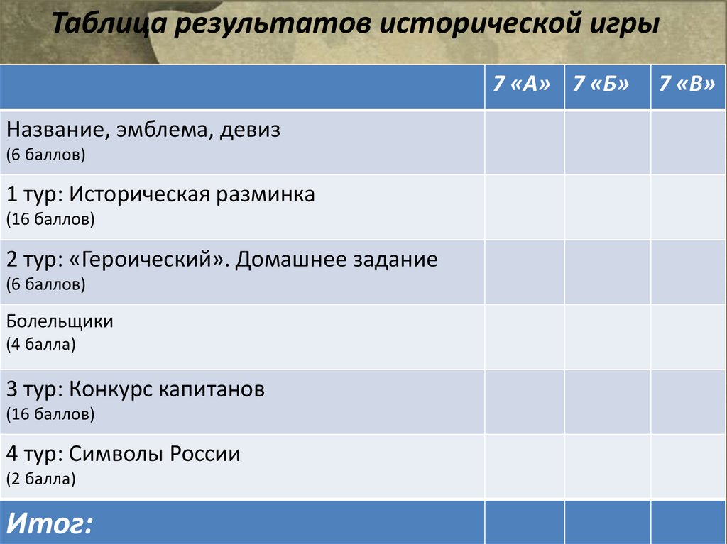 Таблица результатов исторической игры7 «А» 7 «Б»