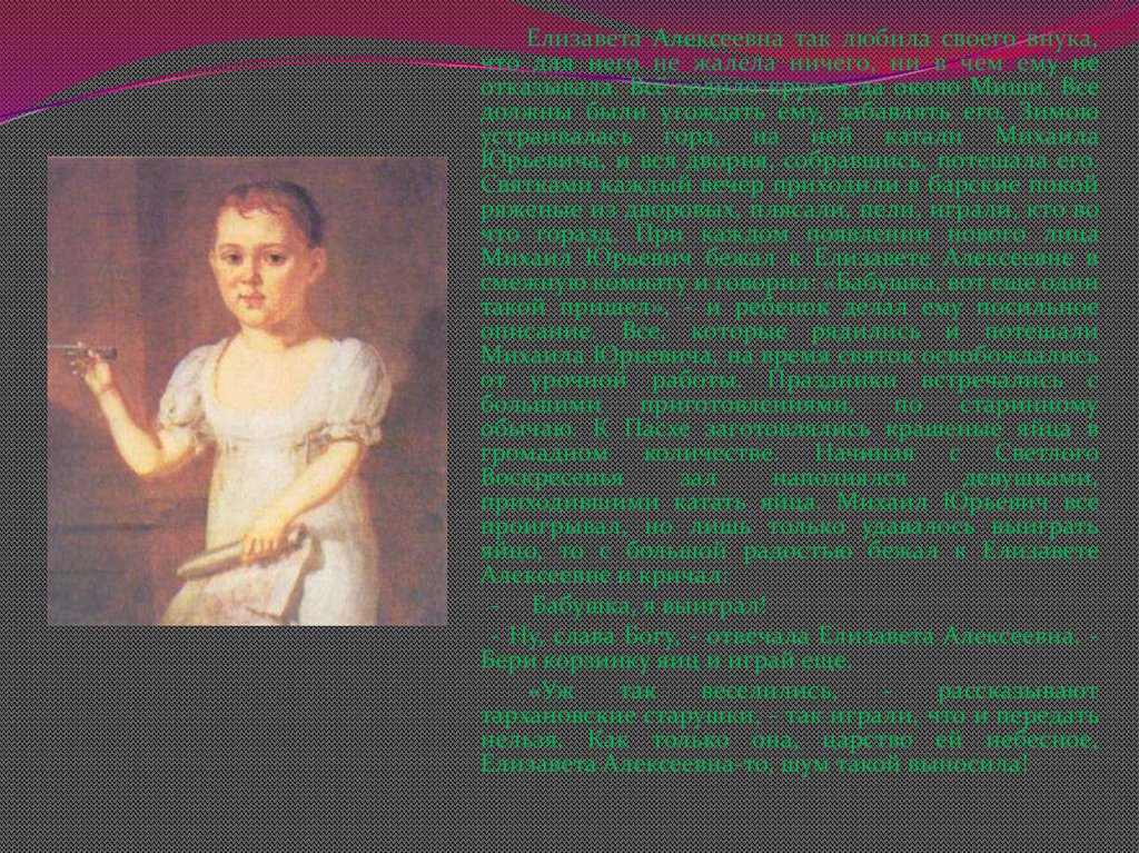 Елизавета Алексеевна так любила своего внука,что для него не жалела ничего, ни в чем ему не