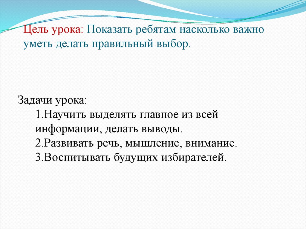 Цель урока: Показать ребятам насколько важноуметь делать правильный выбор.
