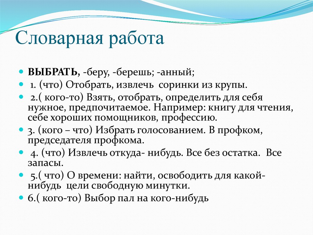 Словарная работаВЫБРАТЬ, -беру, -берешь; -анный;