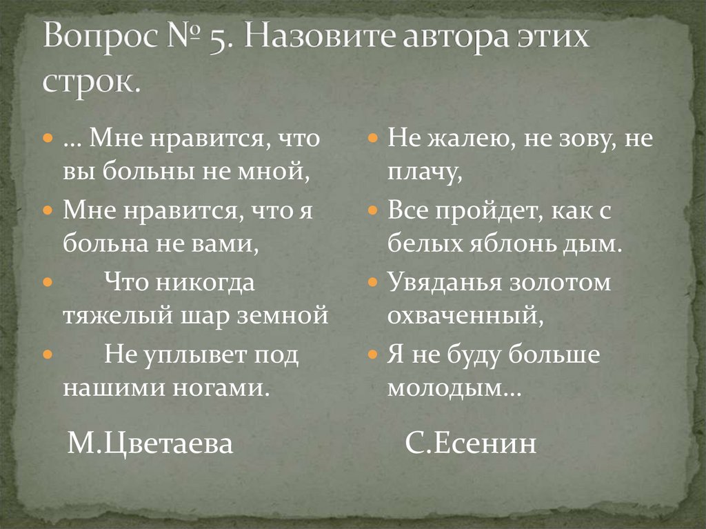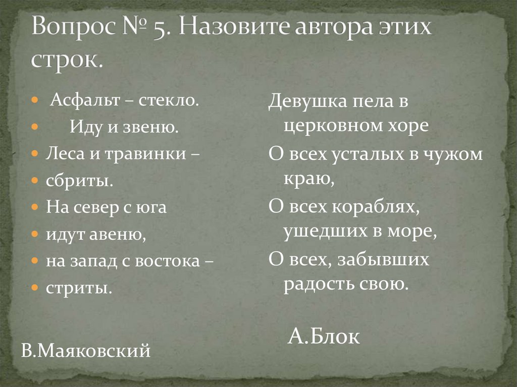 6. Вопрос № 5. Назовите автора этих строк.