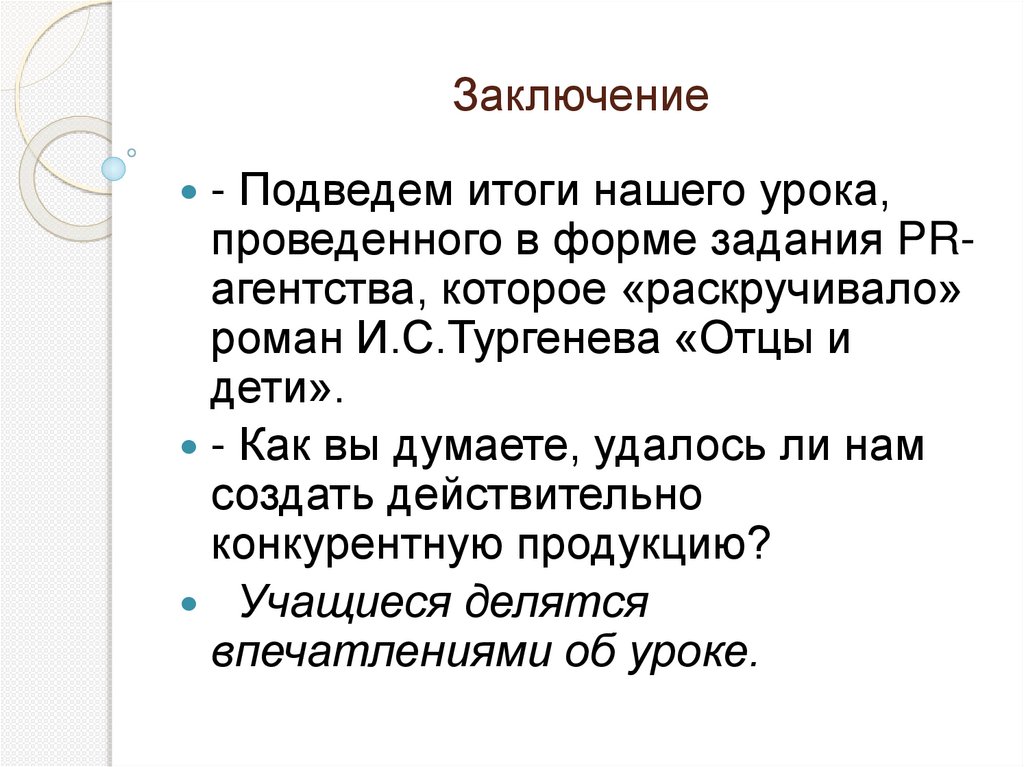 Урок по роману И.С. Тургенева «Отцы и дети» в форме заседания PR-кампании