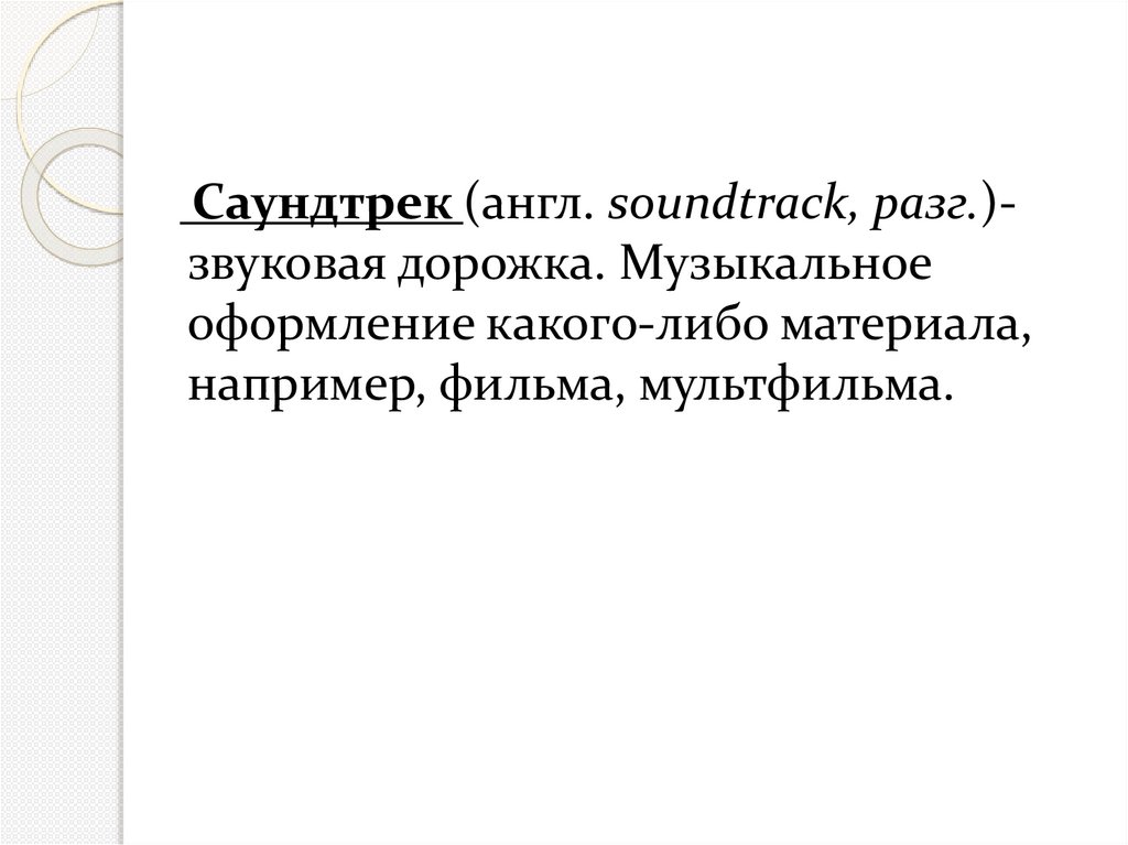 Саундтрек (англ. soundtrack, разг.)звуковая дорожка. Музыкальноеоформление какого-либо материала,