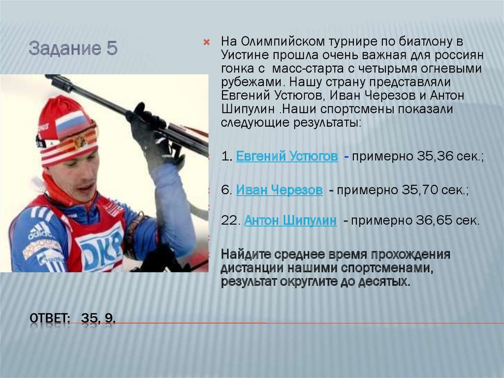 Задание 5На Олимпийском турнире по биатлону в