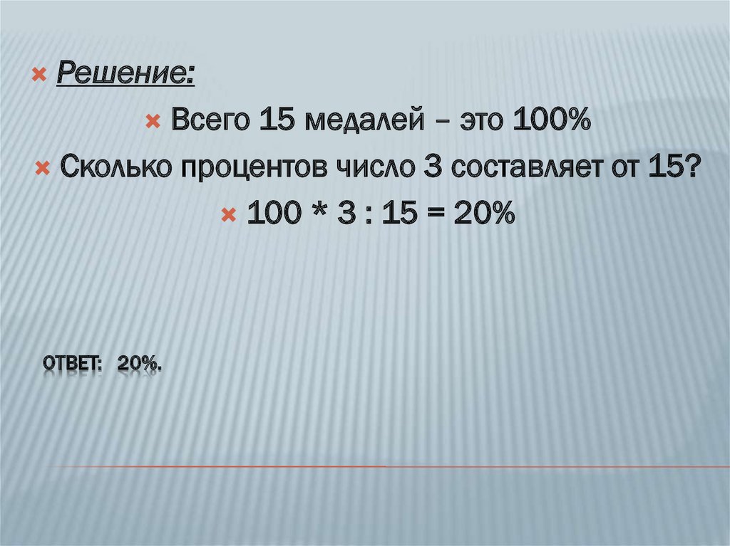 Решение:Всего 15 медалей – это 100%
